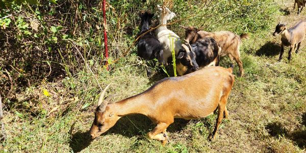 Goats enjoy a variety of vegetation that we do not. They eat invasive species such as poison oak, poison ivy, honey suckle, muscadine vines, wisteria, and kudzu. Some of these weeds can take over rather quickly.